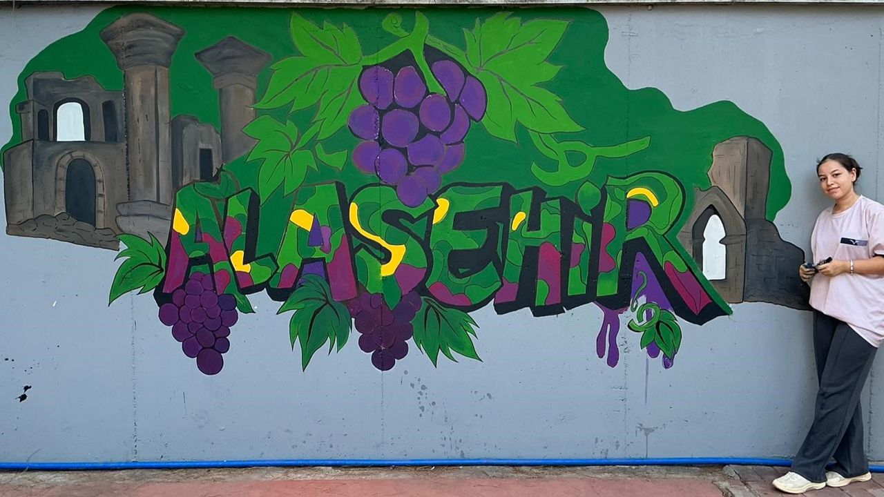 Graffiti tarzında hazırlanan projede "Alaşehir" yazısı, ilçenin dünyaca ünlü sultaniye üzümü, tarihi surları, sur kapıları ve St. Jean Kilisesi gibi öne çıkan değerlerle süslendi.
