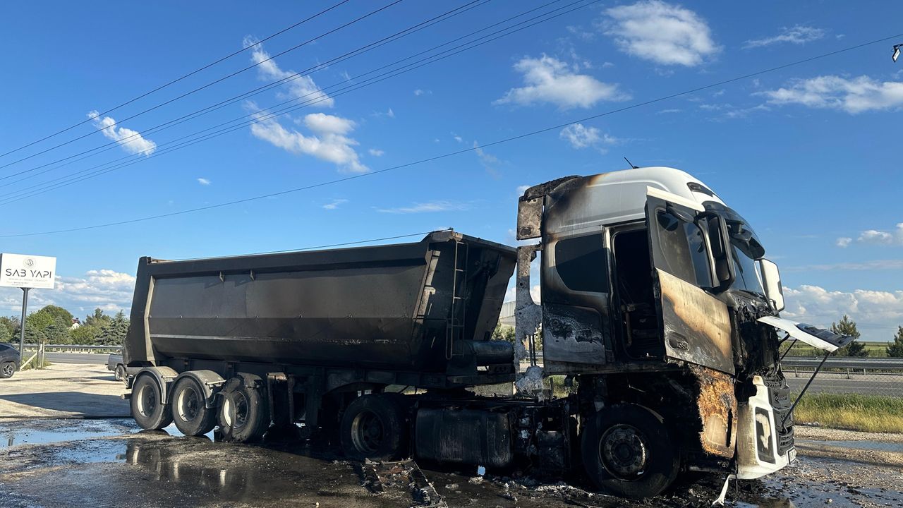 Uşak'ta park halindeyken alev alarak yanan tır kullanılamaz hale geldi.