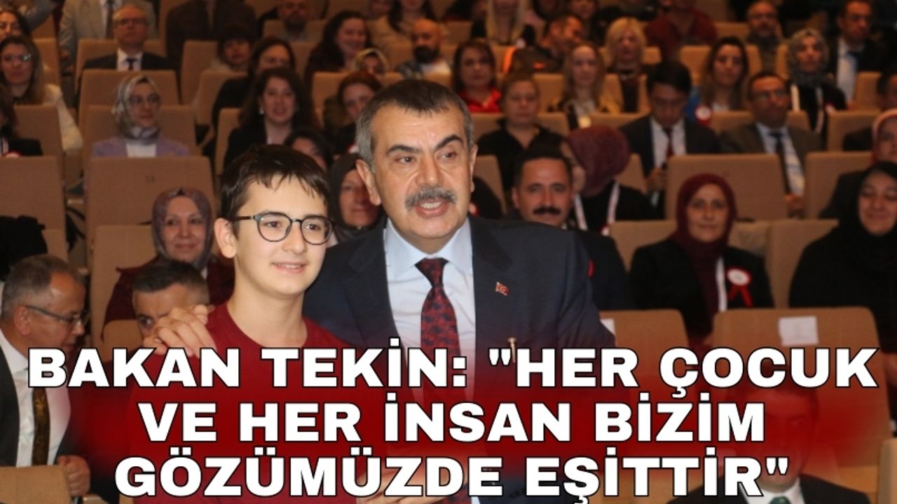 Bakan Tekin, dünyada var olan eğitim sisteminin insanlığı örnek almadığını ve bu yüzden soykırımların, savaşların ve ırkçılığın yaygınlaştığını vurgulayarak, "Bugünlerde dünyanın her tarafında canımızı sıkan, hoşumuza gitmeyen davranışların, olayların arka planında eğitim sistemleri olduğu gerçeğinden hareket ettik ve diyoruz ki eğer dünyada bütün eğitim sistemleri kardeşlik, bağımsızlık, insan hakları, demokrasi, adalet, özgürlük gibi değerleri eğitim sistemleri kendi içerisinde çocuklara kazandırsaydı eğer, dünyanın hiçbir tarafında savaşlar, insan hakları ihlalleri, bebek ölümleri, bebekleri katletmeye varan vahşilikler yaşanmazdı. En son İsrail'in Gazze'de bütün dünyanın gözü önünde yaşattığı zulüm, on binlerce insanın hayatını kaybetmesine neden oldu. Kundaktaki bebeklerin hunharca katledildiği, yüz binlerce insanın yerinden yurdundan edildiği bir süreç yaşandı. Burada iki tane önemli konu var. Birincisi İsrail'in bu vahşeti yapabilmesi, ikincisi ise dünyanın bir dizi insan haklarına rağmen, insan haklarını korumakla mükellef bir dizi musallat üretim varlığına rağmen yaşanan bu vahşete karşı sessiz kalmasıdır. Dünyadaki eğitim sistemleri, devletin varlık sebebine uygun hareket etmiyor. Türkiye Cumhuriyeti Devleti olarak 2002 yılından itibaren eğitimde fırsat eşitliğinin bir temel insan hakkı olarak gördük. Kılığı ya da kıyafeti, etnik ya da dini farklılığı nedeniyle hiç kimsenin eğitim öğretim hakkından mahrum bırakılamayacağını bir referans olarak aldık ve Türkiye'nin her tarafında hiçbir ayrım gözetmeksizin her çocuğumuzun eğitime eşit bir biçimde erişebileceği bir altyapıyı, hem fiziki hem de hukuki olarak oluşturduk" diye konuştu.