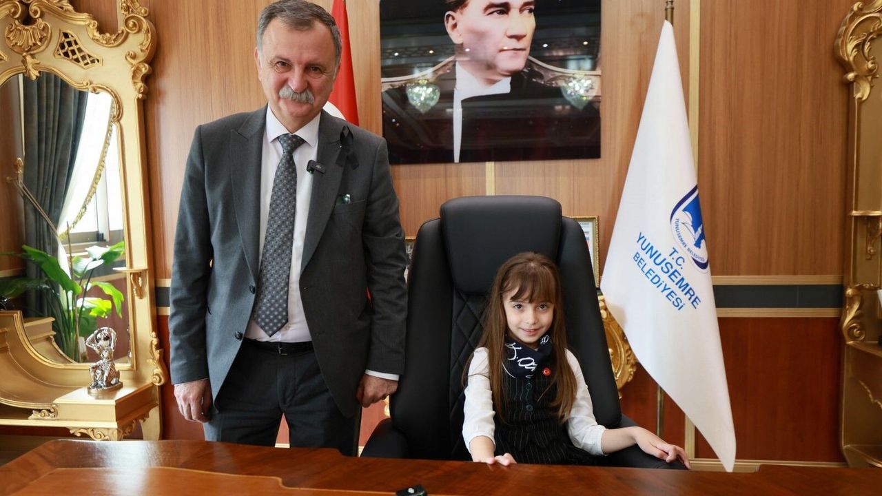 Yunusemre Belediye Başkanı Semih Balaban, 23 Nisan Ulusal Egemenlik ve Çocuk Bayramı’nda makamında çocukları konuk etti. Yunusemre Belediyesi Barış Manço Çocuk Kültür ve Sanat Merkezi öğrencisi Derin Beklergül, 23 Nisan Ulusal Egemenlik İlkokulu 1. sınıf öğrencisi Günnur Berrak Koç, kardeşi Öykü Nisa Koç, Hatice Görgülü İlkokulu 1. Sınıf Öğrencisi Mehmet Serhan Şengel, Üzümcüler İlkokulu 3. sınıf öğrencisi Emre Büyükşahin’i konuk etti. Makamı temsili olarak Başkan Balaban’dan devralan 23 Nisan Ulusal Egemenlik İlkokulu 1. sınıf öğrencisi Günnur Berrak Koç’un heyecanı ise görülmeye değerdi.