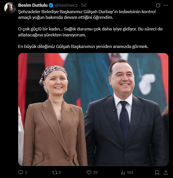 "Şehzadeler Belediye Başkanımız Gülşah Durbay’ın tedavisinin kontrol amaçlı yoğun bakımda devam ettiğini öğrendim. O çok güçlü bir kadın… Sağlık durumu çok daha iyiye gidiyor.
