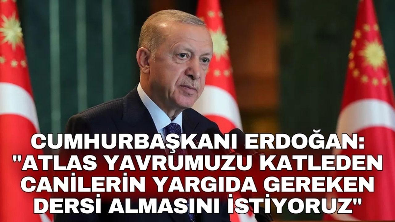 Cumhurbaşkanı Recep Tayyip Erdoğan, Cumhurbaşkanlığı Külliyesi'nde gerçekleştirilen Kabine Toplantısı sonrasında basın mensuplarına açıklamada bulundu. Kabine ve Türkiye gündemine dair konuşan Cumhurbaşkanı Erdoğan, bıçaklanarak öldürülen Atlas ile ilgili de konuşarak, "Atlas yavrumuzu katleden canilerin burada özellikle yargıda gereken dersi almasını istiyoruz" ifadelerini kullandı.