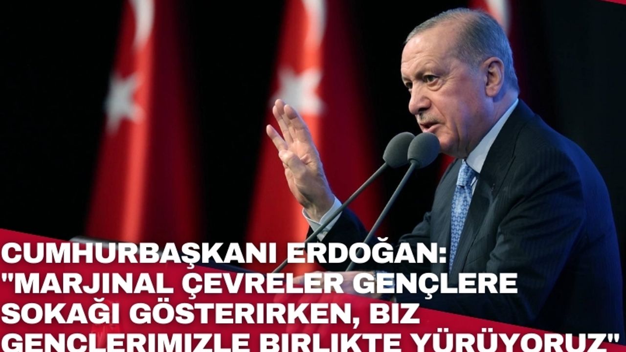 Gençlerin muhalefet tarafından kullanıldığını söyleyen Erdoğan, "Şunu bugün bir kez daha görüyorum ki, muhalefetin başını çektiği marjinal çevreler, bu ülkenin gençlerine sokağı adres gösterirken, biz ekonomideki hedeflerimize gençlerimizle birlikte yürüyoruz. Boğazlarına kadar battıkları rüşvet ve yolsuzluk çamurundan duygularını manipüle ettikleri gençlerin omuzlarına basarak kurtulmaya çalışanlara rağmen biz gençlerimizi el üstünde tutuyor, onlara destek oluyoruz. Hükümet olarak gençlerimize daha iyi bir gelecek sağlamak için elimizden geleni yapmanın çabası içindeyiz. Çünkü bizim derdimiz var, bu ülkeyle ilgili hayallerimiz var. Büyük ve güçlü Türkiye vizyonumuz var. Bunun için siyasette, eğitimde, bürokraside, iş hayatında, sivil toplumda ve daha pek çok alanda kaynaklarımızı seferber ediyoruz. Vizyonlarına her zaman inandığımız gençlerimizin bilgisinden, dinamizminden ve kabiliyetlerinden istifade etmeye önem veriyoruz. Bununla birlikte eğitim ve istihdam arasındaki kopukluğu giderecek, sistemin aksayan yanlarını tamir edecek adımlar atmayı da sürdürüyoruz" diye konuştu.