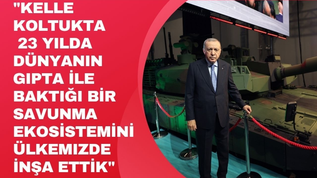 Savunma sanayinde devletin desteği, özel sektörün dinamizmiyle birleşince son yıllarda büyük bir ivme yakalandığına dikkat çeken Cumhurbaşkanı Erdoğan," Şöyle sözleri bir 20 yıl, 25 yıl geriye götürmek istiyorum. Ülkemizde bir toplu iğne üretebiliyor muyduk? Toplu iğne, silahtan bahsetmiyorum, hayır. Ama şu anda hamdolsun silahlarını üreten bir Türkiye var. Savunma sanayinde yüzde 20’yi bile üretemiyorduk, ama şimdi yüzde 80’i yakaladık. İnsansız hava araçları, nerede, böyle bir imkânımız var mıydı? Yok. Ama şimdi insansız hava araçlarını üreten, silahlı insansız hava araçlarını üreten, Akıncı’sını üreten bir Türkiye var. Son teknolojiye sahip hava, kara, deniz araçlarımızla destan yazmaya devam ediyoruz. Artık yalnızca takip eden değil, takip edilen bir devletiz. Modern silah sistemlerinden kompleks koruma paketlerine, sürüş destek modüllerinden elektronik harp altyapısına kadar her hamlesi, her ürünü merakla beklenen bir ülkeyiz" dedi.