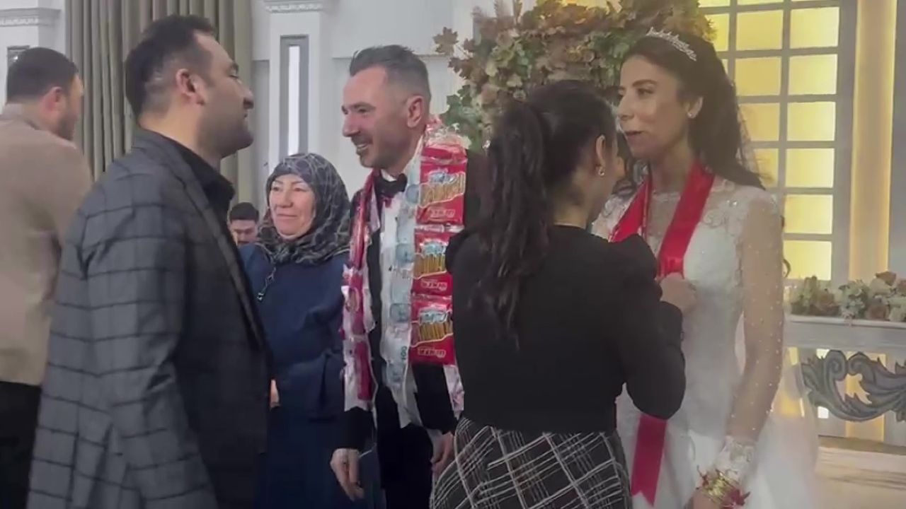 Amasya'da Emre ve Zeynep Aslan çiftinin düğününde damada arkadaşları şaka amaçlı bir kutu çubuk kraker hediye etti. Damat boynuna asılan hediyeleri şaşkınlıkla karşılaşırken, konuklar kahkahalara boğuldu.