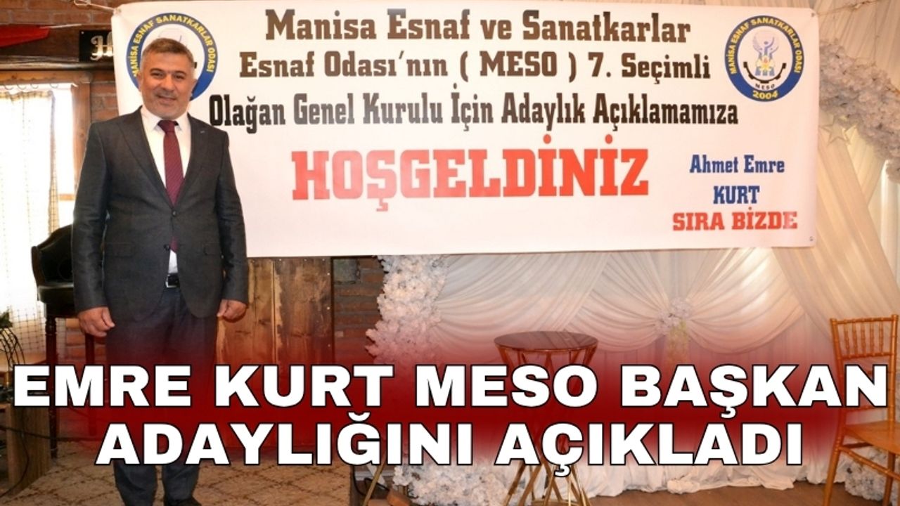 Manisa’da uzun yıllardır esnaflık yapan Emre Kurt, 2026 yılında yapılacak olan Manisa Esnaf ve Sanatkarlar Odası’nın (MESO) 7. Seçimli Genel Kurulu’nda ‘Manisa esnafı için sıra bizde’ sloganıyla başkanlığa aday olduğunu açıkladı. Çiçekçilik esnafı olan Emre Kurt, önümüzdeki günlerde de projelerini duyuracağını belirtti. Kurt, "Bugün burada Manisa esnafımızın geleceği, bir hayalin gerçekleşmesi adına atılan ilk adamın startını vermek için bir araya geldik. 2026 yılı Manisa esnafımızın geleceğe güvenle bakabilme adına bir karar vereceği önemli bir yıl olacak. Şehzadeler şehri, Ahi Evran yolu Manisa’mızda ilimizin en büyük ikinci odası olan Manisa Esnaf Odası'na (MESO) ekibimizle birlikte bir kez daha talip olduk. 2 bini aşkın üye sayımızla Olağan Genel Kurulumuzda değerli üyelerimizin karşısına çıkarak güveninizi isteyeceğiz. Bu sebeple Manisa esnafı için sıra bizde diyoruz" dedi.