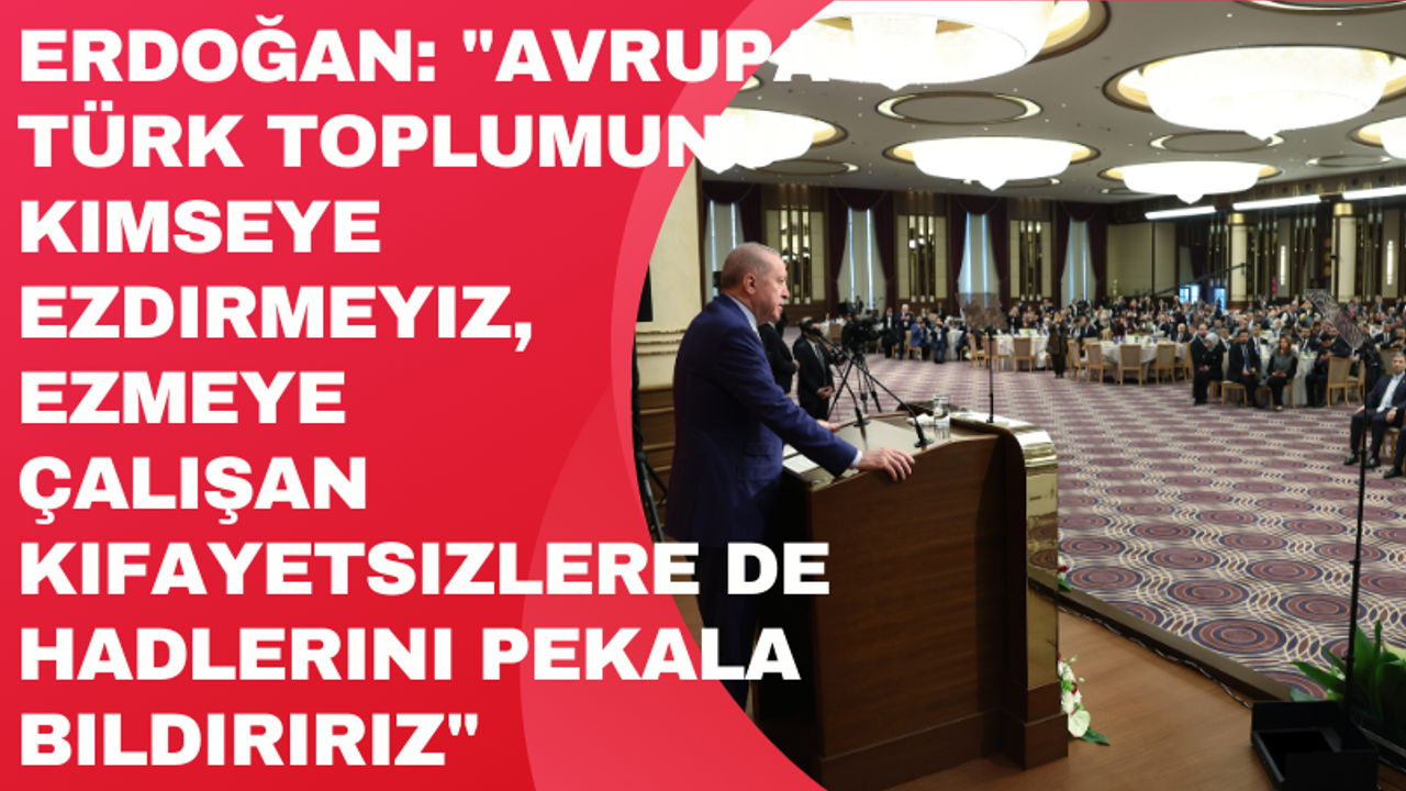 Cumhurbaşkanı Erdoğan yurt dışında yaşayan Türklerin haklarını kimseye ezdirmeyeceklerini vurgulayarak, "Tertemiz emekleriyle, tertemiz niyetleriyle, Türkiye Yüzyılı yürüyüşümüze eşlik eden, Avrupa Türk toplumunu kimseye ezdirmeyiz, ezmeye çalışan kifayetsizlere de hadlerini pekala bildiririz. Tekrar söylüyorum, size kimse üvey evlat muamelesi yapamaz. Size kimse parmak sallayamaz. Üst perdeden ayar veremez. Şunu asla ve asla unutmayın sevgili kardeşlerim. Avrupalı Türkler olarak sizler, bu vatanın öz ve öz evlatlarısınız. Sizler bu memleketin asli unsurlarısınız. Sizler bu ülkenin dünyaya açılan kapılarısınız. Sizler nerede yaşarsanız yaşayın, canımızdan bir parçasınız. Geçmişteki iktidarlar sizi yok saymış olabilir, ihmal etmiş olabilir. Birileri on yıllar boyunca size döviz penceresinden bakmış olabilir. Ama bizim her birimiz ve sizin her biriniz dünyanın dört bir yanında hayat kurmuş 7 milyon insanımızla birlikte hürmet ve hizmetin en iyisine layıksınız" ifadelerini kullandı.