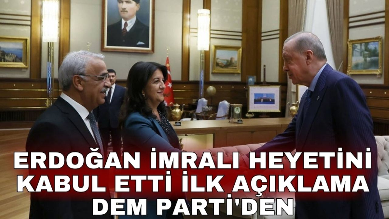 DEM Parti heyeti, Cumhurbaşkanı Recep Tayyip Erdoğan ile görüştü. Görüşmenin ardından DEM Parti'nin sosyal medya hesabından yapılan açıklamada, "DEM Parti İmralı Heyeti Üyeleri Pervin Buldan ve Mithat Sancar, Cumhurbaşkanı Erdoğan ile Beştepe'de bir görüşme gerçekleştirdi. Heyetimiz, yaklaşık 1 saat süren görüşmede barış ve demokratik toplum sürecinin geldiği aşama ile bundan sonra yapılacaklara ilişkin görüş ve önerilerini sundu" denildi.