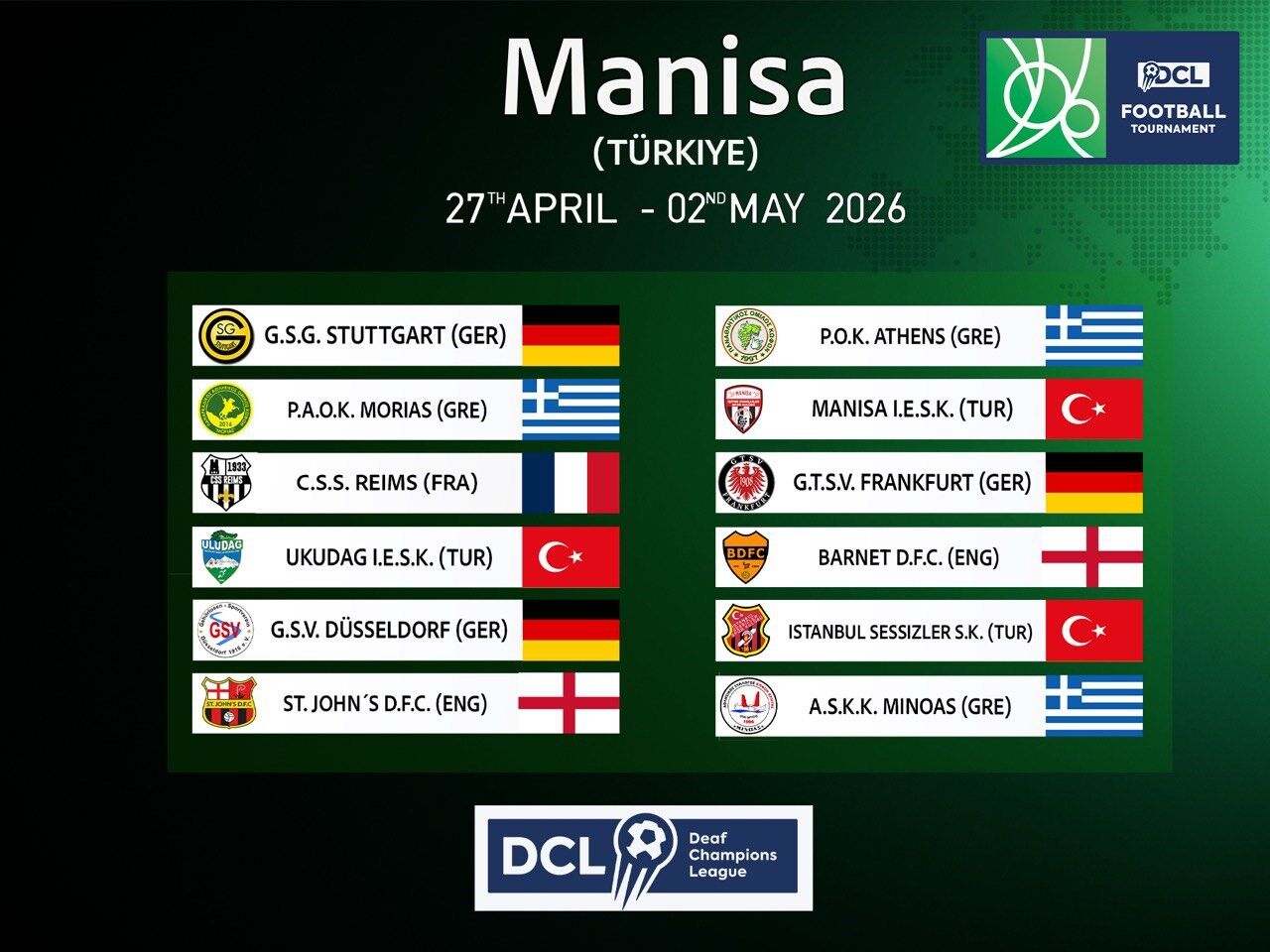 Avrupa'nın en önemli işitme engelliler futbol organizasyonlarından biri olan Deaf Champions League (DCL) - Avrupa İşitme Engelliler Şampiyonlar Ligi, 27 Nisan - 2 Mayıs 2026 tarihleri arasında ilk kez Türkiye'de ve Manisa'da gerçekleştirilecek.