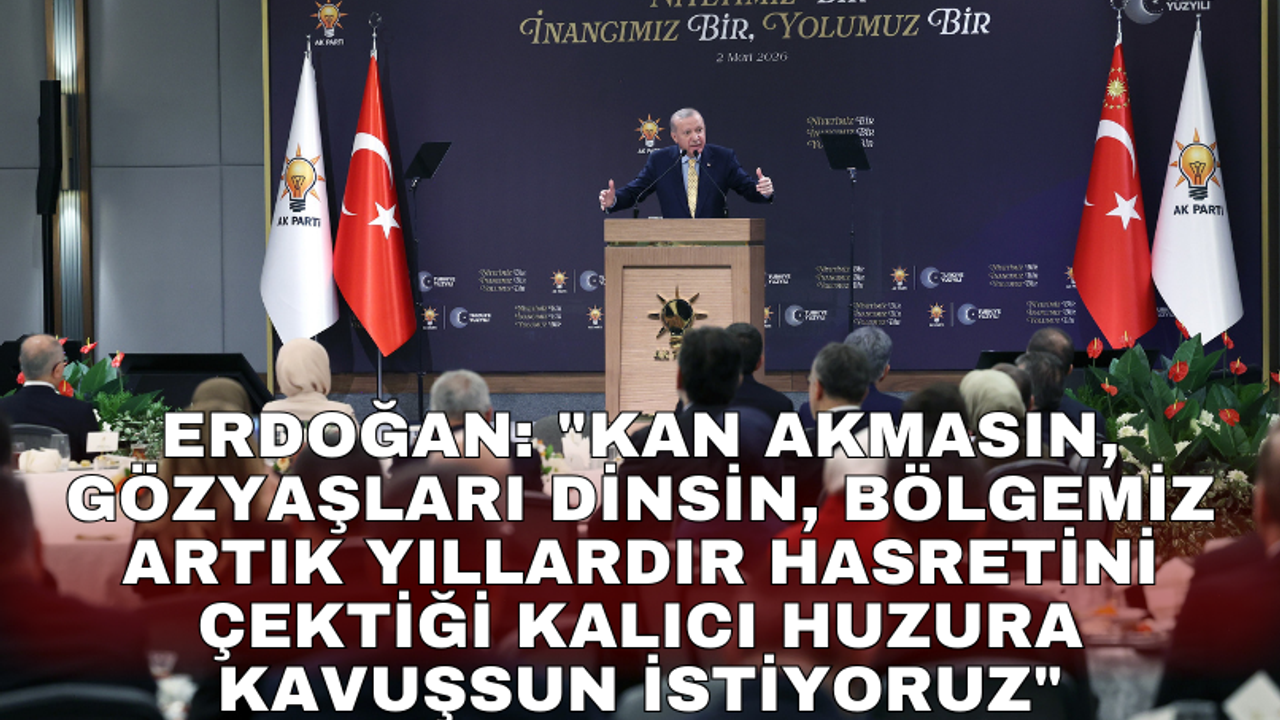Cumhurbaşkanı Erdoğan, AK Parti Genel Merkez binasında gerçekleştirilen AK Parti Genel Merkez 2026 İftar Buluşması’na katıldı. Burada konuşan Erdoğan, AK Parti olarak manevi duyguların doruk noktasına çıktığı, sevginin, muhabbetin, yardımlaşmanın, dayanışmanın daha bir anlam kazandığı Ramazan ayını en güzel şekilde idrak etmenin çabasında olduklarını ifade ederek, genel merkez birimleri, milletvekilleri, kadın kolları, gençlik kolları, ve yerel yönetimlerle tam kadro sahada olduklarını aktardı. Erdoğan, Ramazan ayında yurt içinde olduğu gibi Halep’ten Saraybosna’ya, Varna’dan Prizren’e kadar yurtdışındaki birçok yerde Ramazan coşkusunu birlikte paylaştıklarını da sözlerine ekledi.