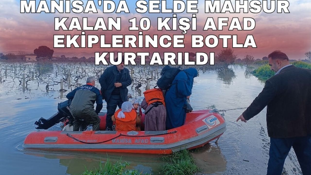 Manisa'da 2 gün boyunca etkili olan sağanak yağışlar nedeniyle Gediz Nehri'nde taşkınlar meydana geldi. Özellikle Yunusemre ve Şehzadeler ilçelerinde bazı tarım arazileri ve yerleşim alanları sular altında kalırken, bölgedeki 10 kişilik bir aile yükselen su seviyesi nedeniyle mahsur kaldı. İhbar üzerine bölgeye Manisa İl Afet ve Acil Durum Müdürlüğü (AFAD) ekipleri ile birlikte itfaiye ve sağlık ekipleri sevk edildi. Ekipler, suyun hızla yükselmesi ve karadan ulaşımın mümkün olmaması nedeniyle kurtarma çalışmalarını botlarla gerçekleştirdi. Zamanla yarışan ekipler, aralarında 1 bebek, 1 çocuk ve 3 kadının da bulunduğu toplam 10 kişiyi güvenli şekilde bulundukları noktadan tahliye etti.