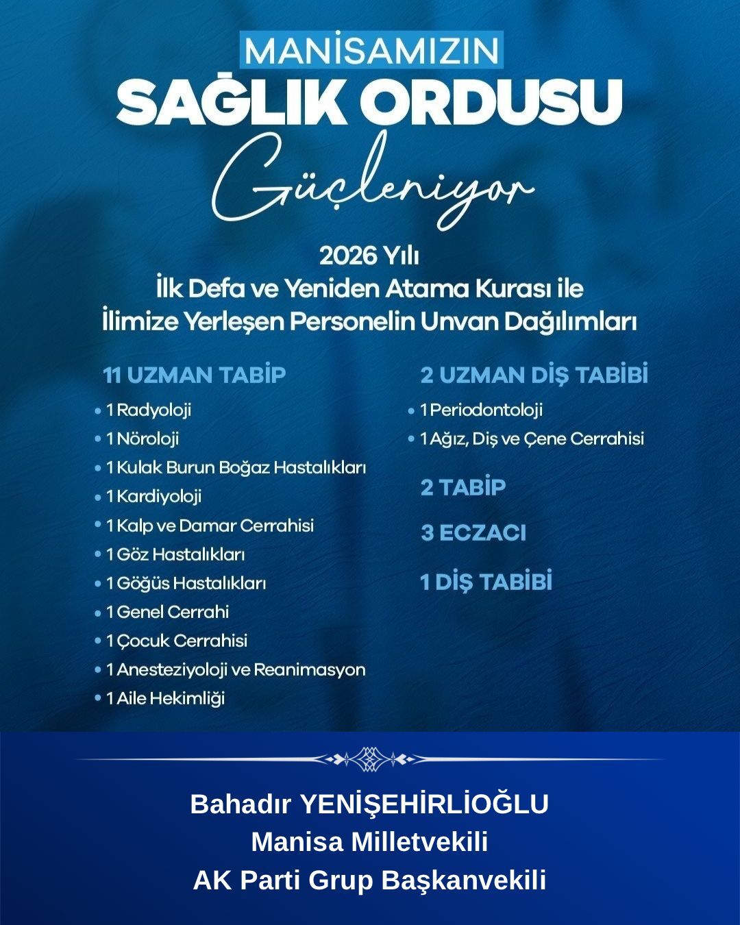 Yenişehirlioğlu yaptığı açıklamada, Manisa’nın sağlık altyapısını güçlendirmeye yönelik çalışmaların kararlılıkla sürdüğünü belirterek, “İlimize kazandırılan yeni sağlık personellerimizle hemşehrilerimize daha güçlü ve daha kaliteli sağlık hizmeti sunma yolunda önemli bir adım daha atmış bulunuyoruz” ifadelerini kullandı.