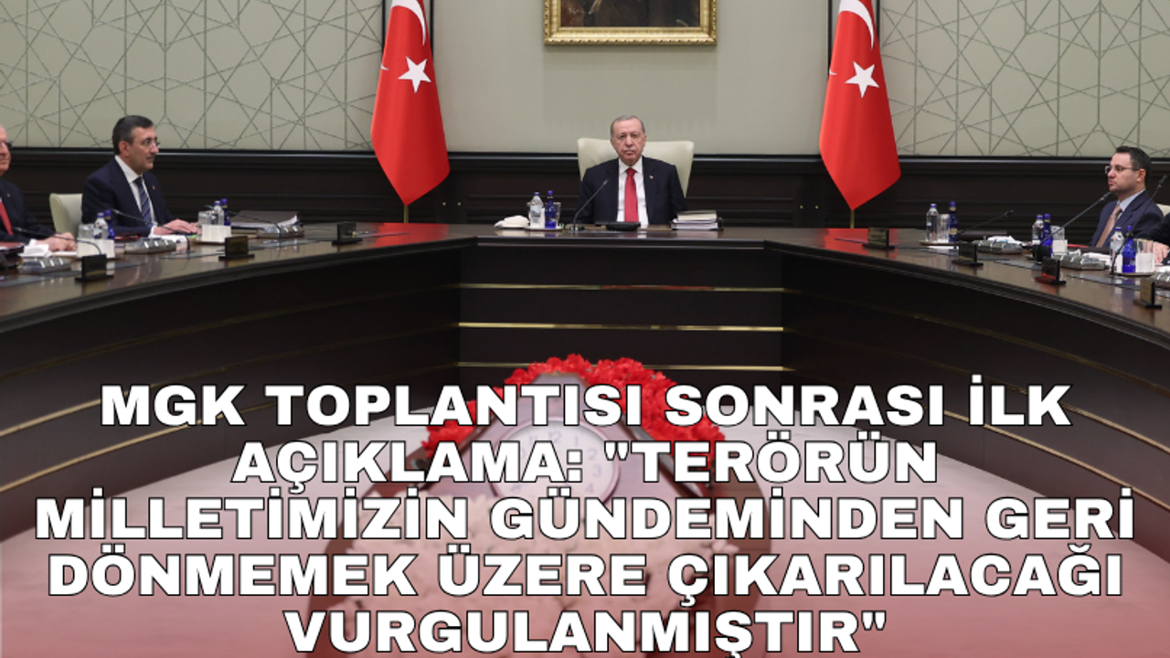 MGK’da Terörsüz Türkiye hedefi ve terörsüz bölge vizyonuna ulaşılması için yürütülen çalışmaların ele alındığı açıklanarak, "Çevremizde yaşanan savaş, çatışma ve tahriklerin süreci sabote etmesine izin verilmeyeceği ve terörün milletimizin gündeminden geri dönmemek üzere çıkarılacağı vurgulanmıştır" ifadeleri kullanıldı.