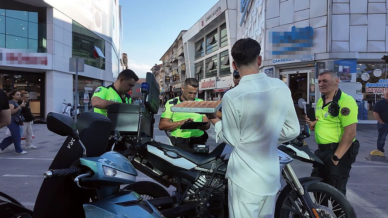Diğer yandan, caddede tehlikenin boyutunu gösteren bir görüntü ortaya çıktı. Hem kask takmayan hem de motosiklet kullanırken bir elinde baklava tepsisi taşıyan sürücüsü cezaya itiraz edemedi. Baklava tepsisini bırakan sürücüye de 993 lira cezai işlem uygulandı.
