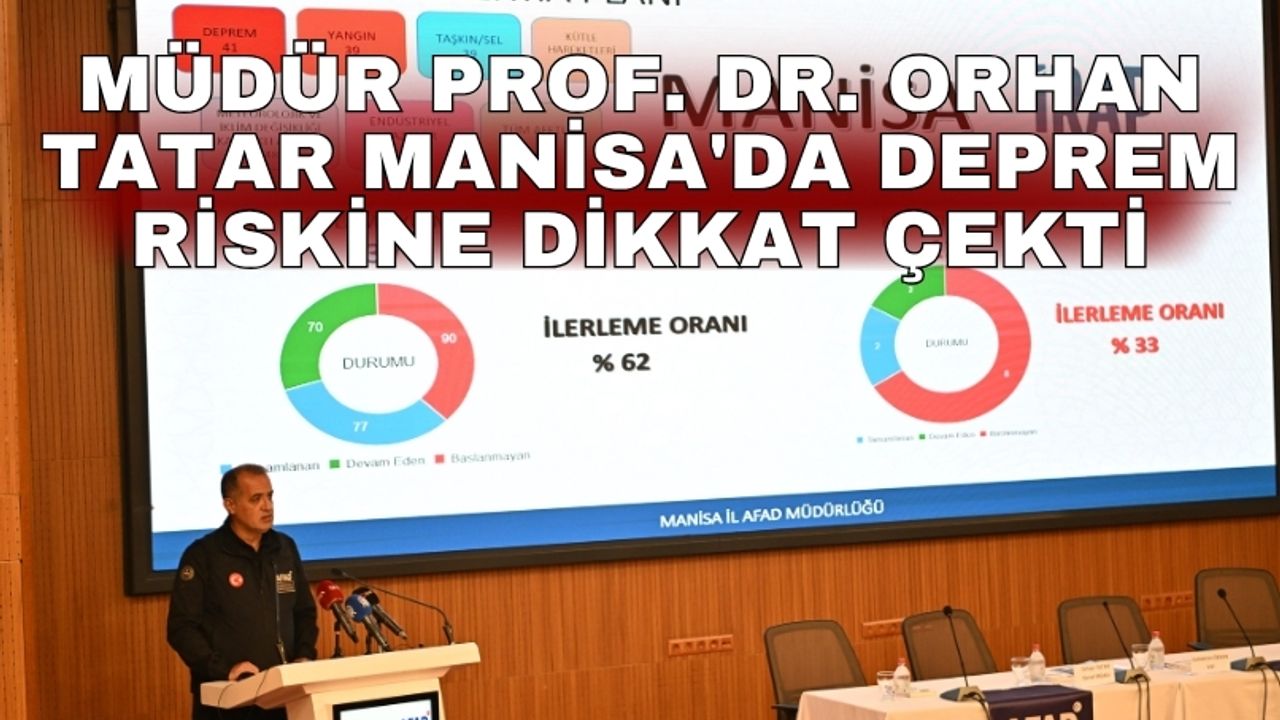 Manisa'nın afet tehlikelerinin en fazla barındıran illerden bir tanesi olduğunu söyleyen AFAD Deprem ve Risk Azaltma Genel Müdürü Prof. Dr. Orhan Tatar, "Manisa afet tehlikelerini bünyesinde en fazla barındıran illerimizden bir tanesi. İRAP'a bile baktığınızda 11 tane farklı afet türü tanımlanmış. Bunların içerisinde en fazla kütle hareketleri, sonra meteorolojik afetler, sonra deprem vesaire böyle gidiyor. Endüstriyel kazalardan maden kazalarına kadar, orman yangınlarına kadar birçok farklı farklı afet türlerine dair eylemler tanımlanmış. Ama tabii bunların içerisinde özellikle deprem bizi çok korkutuyor, çok ürkütüyor. Deprem dediğiniz şey anlık bir olay. Yani 10 saniyelik bir sürede başımıza geliyor ve geriye dönüp baktığımızda hakikaten büyük kayıplarla karşı karşıya kalabiliyoruz" diye konuştu.