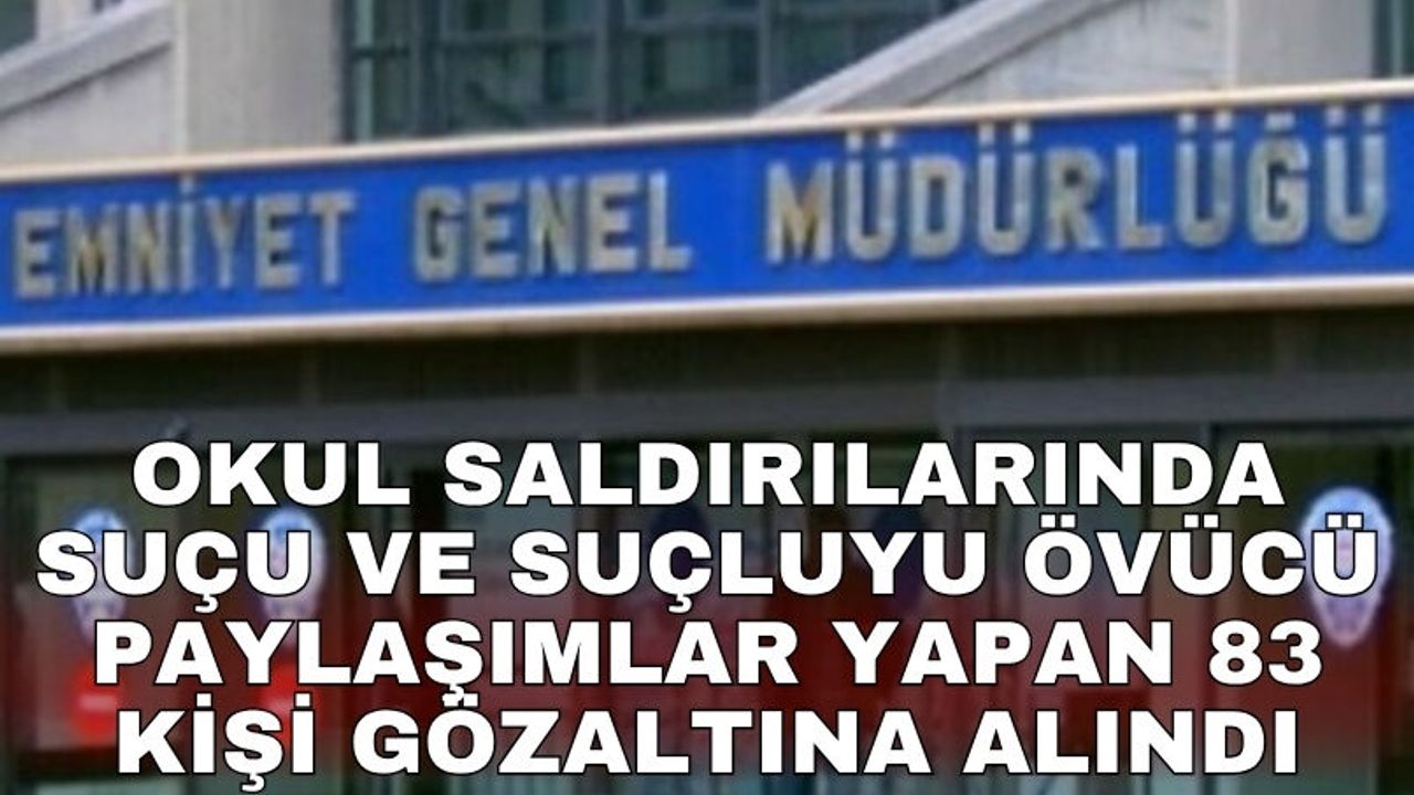Emniyet Genel Müdürlüğü'nün sosyal medya hesabından yapılan paylaşımda, Şanlıurfa ve Kahramanmaraş’taki okul saldırılarına ilişkin provokatif paylaşım yapan 940 hesaba erişim engeli getirildiği belirtildi. Paylaşımda, "Şanlıurfa ve Kahramanmaraş’ta meydana gelen okul saldırılarına ilişkin yürütülen çalışmalar kapsamında suçu ve suçluyu övücü nitelik taşıyan, kamu düzenini olumsuz etkilemeye yönelik paylaşım ve faaliyetlerde bulunduğu tespit edilen 83 şahıs hakkında gözaltı kararı verilmiş, haklarında adli işlem uygulanmıştır. Ayrıca 940 sosyal medya hesabına erişim engeli getirilmiş, 93 adet Telegram grubu kapatılmıştır. Şüphelilerle ilgili adli süreçler, ilgili birimlerimizce çok yönlü olarak sürdürülmektedir" ifadelerine yer verildi.