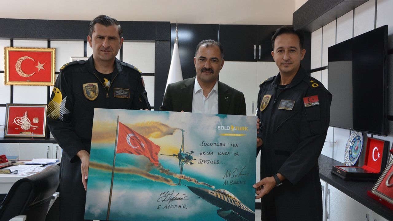 Demirci Kurtuluş Festivali dolayısıyla ilçede gösteri yapacak olan SOLOTÜRK uçuş ekibi Birinci Pilot Binbaşı Murat Bakıcı, İkinci Pilot Binbaşı M. Erhan Aydemir, Basın ve Halkla İlişkiler Subayı Üsteğmen Şükrü Alper Şen ve Basın ve Halkla İlişkiler Astsubayı Üstçavuş Muhammed Bölükbaşı Demirci Belediyesi ziyaretinde Başkan Erkan Kara ile bir araya geldi.