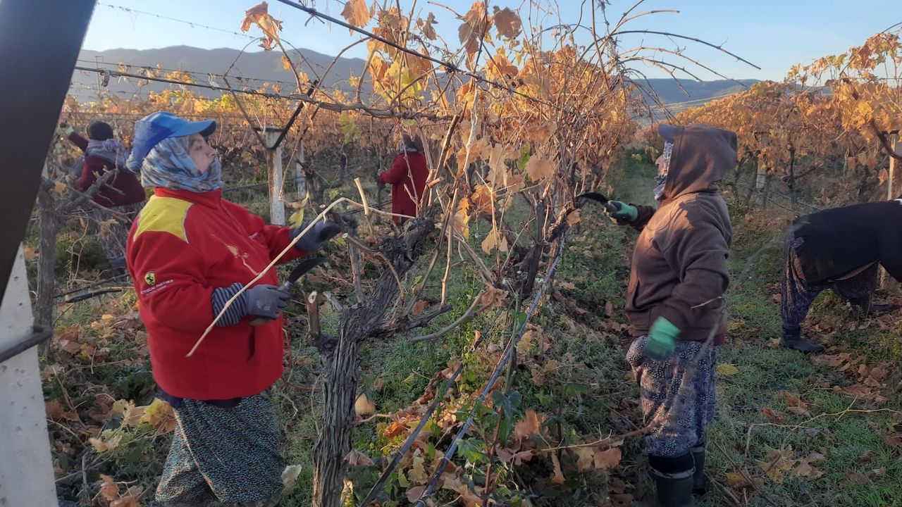 Dayıbaşı Necati Paracı ile birlikte üzüm bağlarına giden kadın işçiler, yenilenecek olan bağlarda asmaların budama işlemlerini yaparak çalışmalara başladı. Uzun yıllardır üretim yapılan ve yaşlanmaya bağlı olarak verim kaybı yaşayan üzüm bağlarında, asmalar köklenmeden önce ana omcadan ayrılıyor.