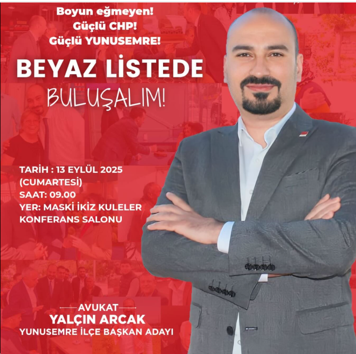 CHP Yunusemre İlçe Kongresi, 13 Eylül 2025 Cumartesi günü saat 10.00’da Maski İkiz Kuleler Konferans Salonu’nda yapılacak. Arcak, tüm yol arkadaşlarını beyaz listede buluşmaya davet etti.