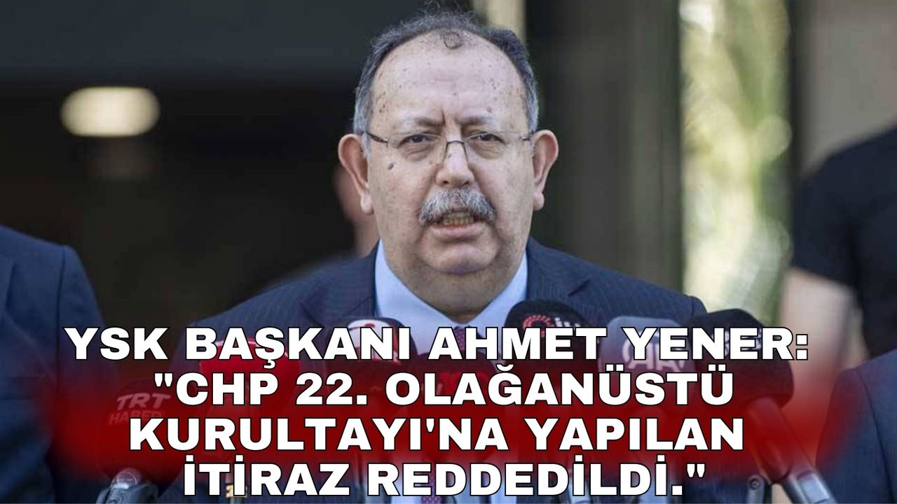 YSK, CHP'nin pazar günü yapılacak 22'nci Olağanüstü Kurultayı'nın iptali için yapılan başvuruyu karara bağladı. Karar sonucunda 22'nci Olağanüstü Kurultayı'nın tam kanunsuzluk nedeniyle iptaline yönelik talebin reddine karar verildiği belirtildi.